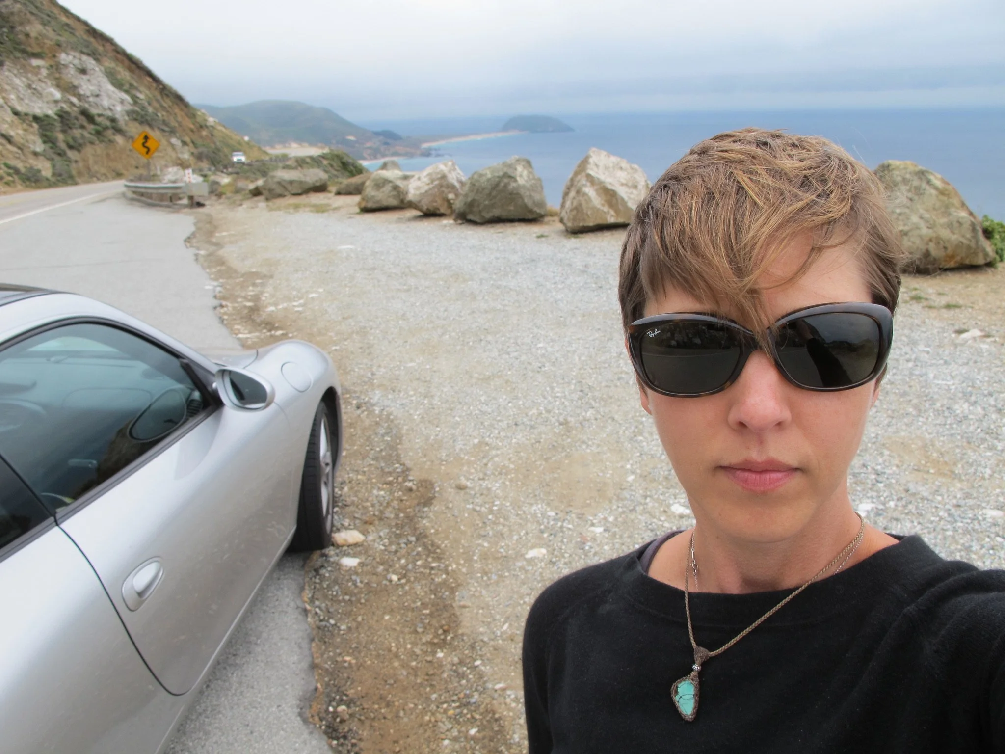 Marnie with her own 2004 Porsche 911 Targa on Highway 1 in California.
